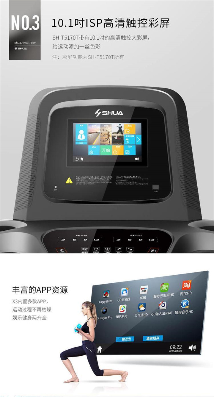 舒华高端跑步机SH-T9100T(V10+)拥有超大高清32寸10点触控晶屏的工业屏,具有扫码、刷卡、人脸识别等多种智能登录方式,方便快捷,并且有在线教学、专业健身模式随意切换,让您开启科学健身。