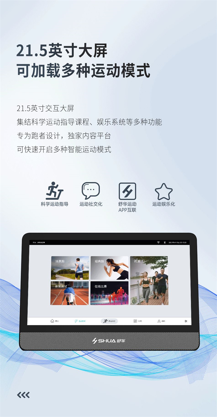 舒华X5 Pro豪华智能跑步机采用全新舒华跑步机系统,搭载21.5寸大屏,内置九种运动程序,包括场景跑、在线约跑和一键体育考试等内容,亦有教练在线科学指导和比赛互动,可在线升级,历经耐久性测试,让您使用更安全,双跑台设计,全减震系统,核心动力采用F级耐高温马达,5.0HP峰值马力,提供源源动力,让您享受每一次畅跑体验。